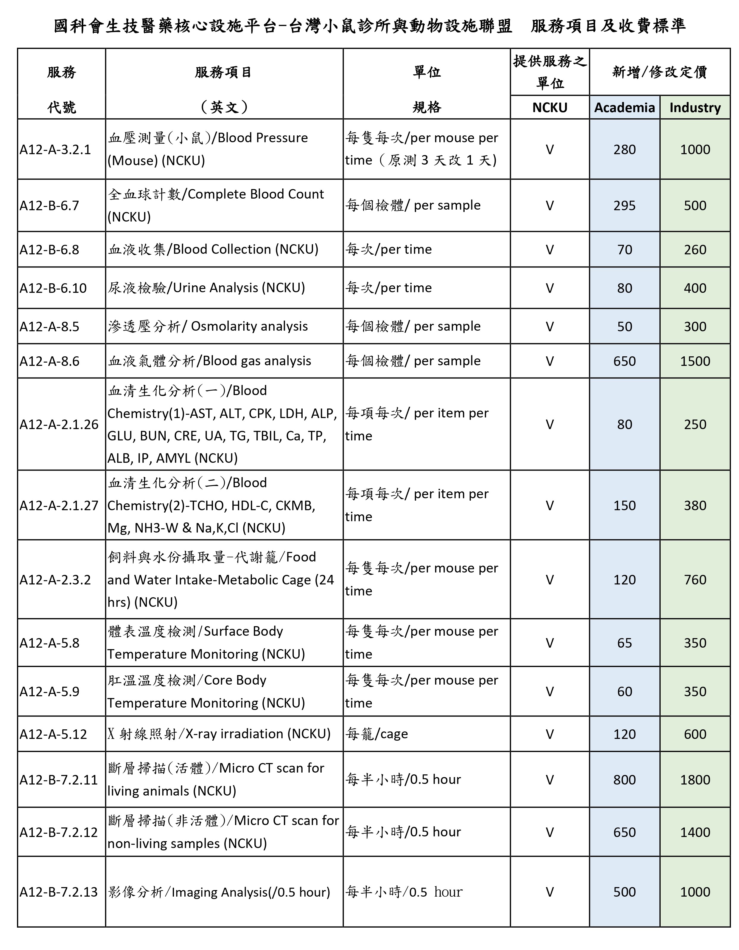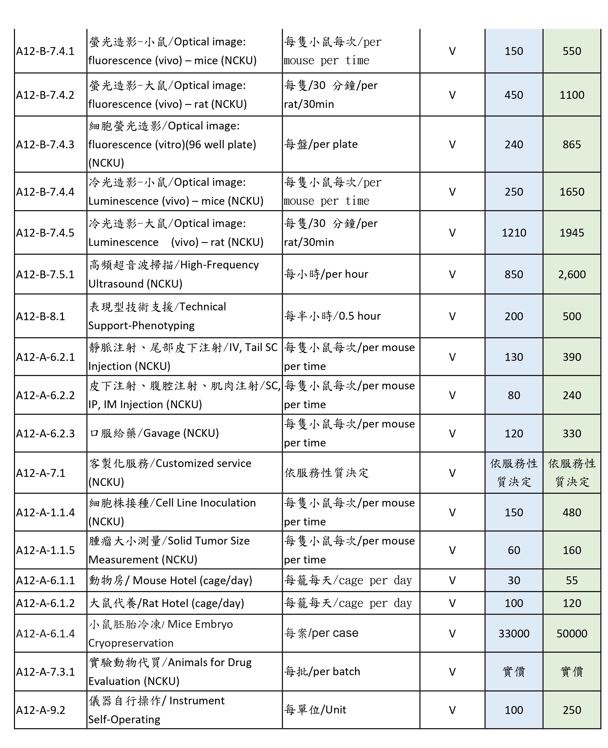 院內動物及代養費價格表